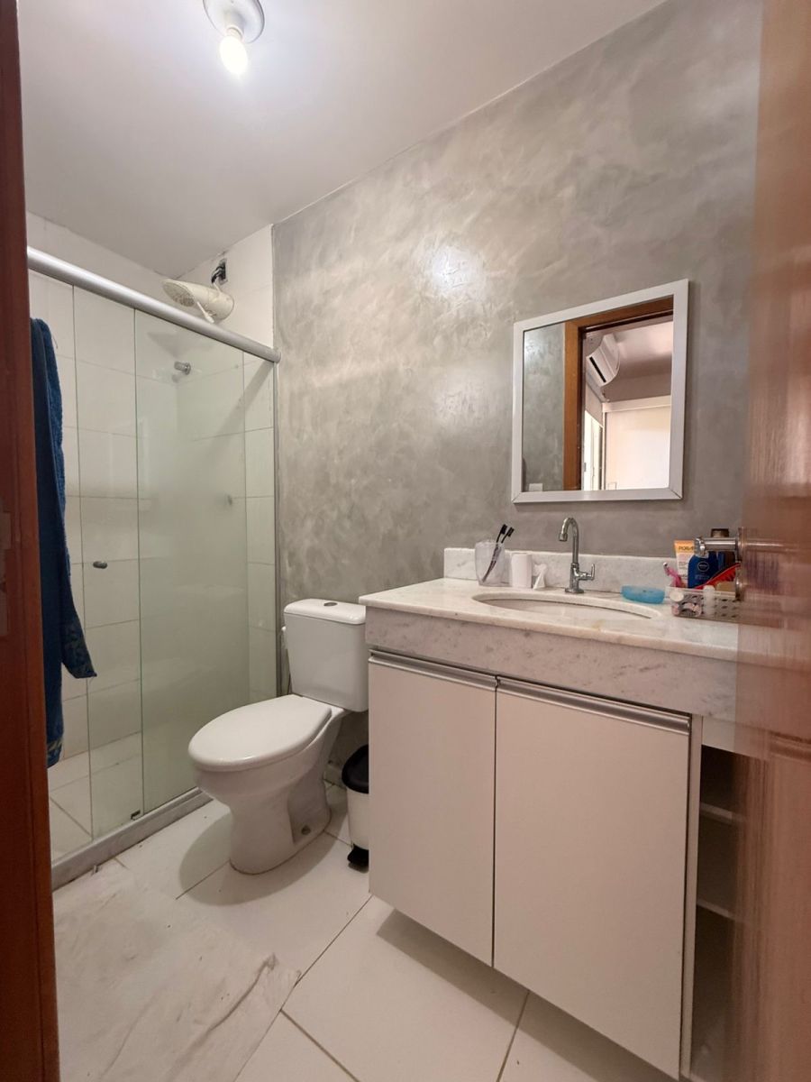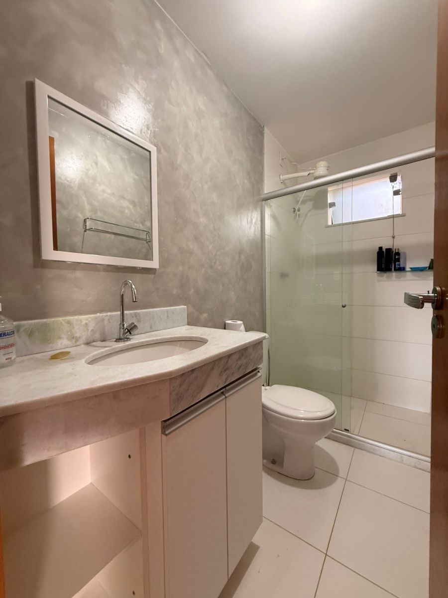 Na área íntima, a casa oferece suíte com ar-condicionado, além de um segundo quarto também climatizado, ideal para dormitório ou home office. Os banheiros contam com armários embutidos, trazendo organização e praticidade.